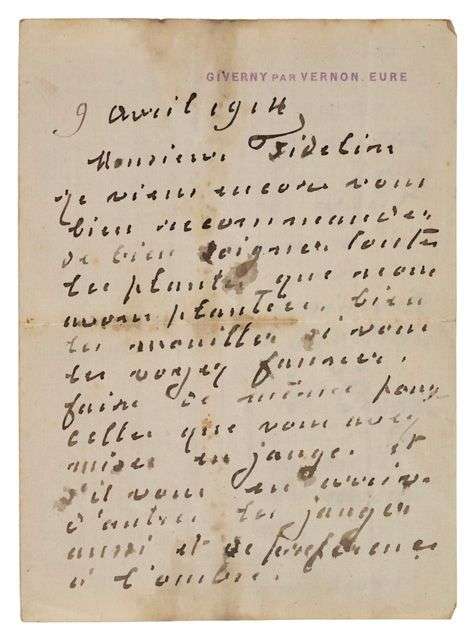 L.A.S. «Claude Monet», Giverny, 9 avril 1914, au jardinier FIDELIN | 2 pages in-8 (un peu salie).