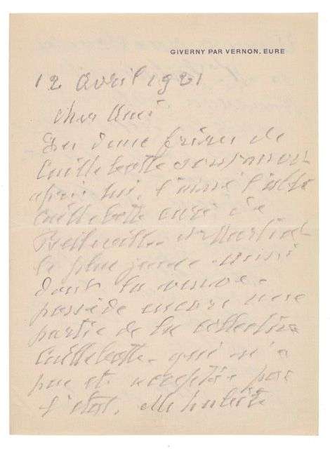 Sur la collection de Gustave Caillebotte. «Les deux frères de Caillebotte sont morts après lui, l'aîné l'abbé Caillebotte curé de Belleville, et Martial le plus jeune aussi dont la veuve possède encore une partie de la collection Caillebotte, qui n'a pas été acceptée par l'état, elle habite Paris [...] Là Mr Tabarant trouvera certainement les renseignements qu'il désire. Il pourrait aussi s'adresser au fils aîné de Renoir, Renoir ayant été l'exécuteur testamentaire de Caillebotte pour la question artistique. [...] Je suis rentré dans mon cher Giverny ravi de ma journée à Paris de m'y être trouvé avec de bons amis, et les yeux remplis de ce que j'ai revu au Louvre cela m'a rempli de joie»...