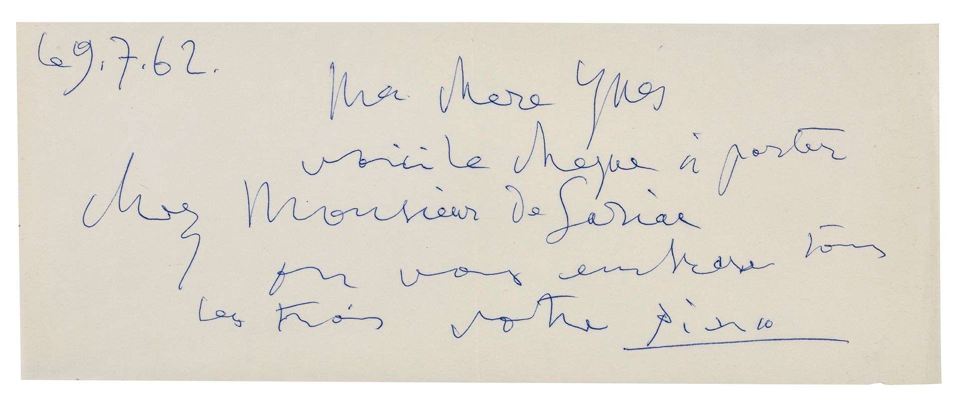 L.A.S. «Picasso», [Mougins] 9 juillet 1962, à Inès SASSIER, 7 rue des Grands Augustins à Paris |1 page oblong in-8 au stylo bille bleu, enveloppe autographe.