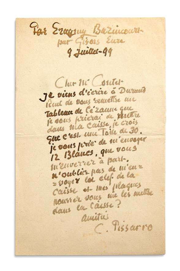Il vient d'écrire à DURAND-RUEL «de vous remettre un tableau de CÉZANNE que je vous prierai de remettre dans ma caisse, je crois que c'est une toile de 30. Je vous prie de m'envoyer 12 Blancs, que vous m'enverrez à part, n'oubliez pas de m'envoyer la clef de la caisse et mes plaques pourriez vous me les mettre dans la caisse ?»...