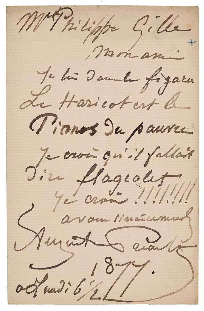 Amusante lettre d'un superbe graphisme. «Je lis dans le Figaro Le Haricot est le Pianos du pauvre. Je crois qu'il fallait dire flageolet. Je crois !!!!!!!!»...