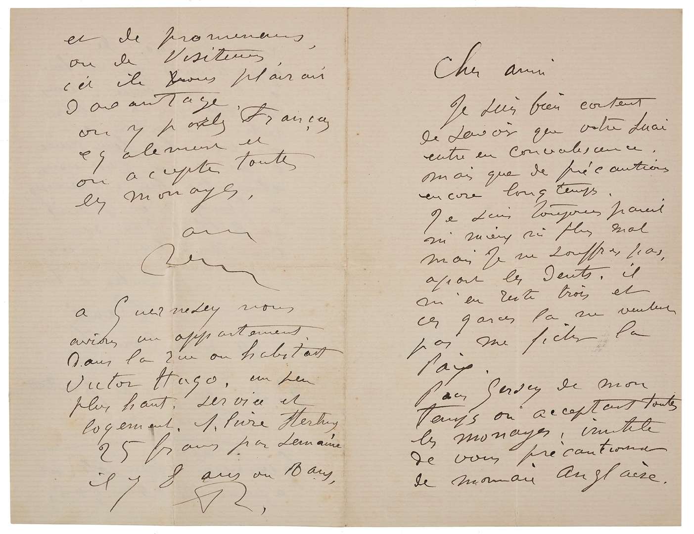 L.A.S. «Renoir», [Paris 31 décembre 1899], à Paul BÉRARD au château de Wargemont près Dieppe | 3 pages in-8, enveloppe. «Je suis toujours pareil ni mieux ni plus mal mais je ne souffre pas, à part les dents. Il m'en reste trois et ces garces là ne veulent pas me ficher la paix». Il donne des conseils à son ami pour un séjour à Jersey : «Guernesey aussi joli, et à peine de Français et de promeneurs ou de visiteurs, cet île vous plairait davantage. On y parle partout français également et on accepte toutes le monayes. [...] à Guernesey nous avions un appartement dans la rue où habitait Victor Hugo, un peu plus haut. Service et logement, 1 livre sterling 25 francs par semaine il y a 8 ans ou 10 ans».