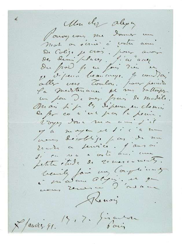 L.A.S. «Renoir», Paris 13 rue Girardon 7 janvier 1891, à Paul ALEXIS | 1 page in-8.