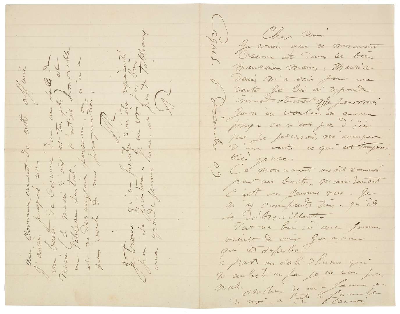 «Je crois que ce monument Cézanne est dans de bien mauvaises mains. Maurice DENIS m'a écrit pour une vente je lui ai répondu immédiatement que pour moi je n'en voulais à aucun prix. Ce n'est pas d'ici que je pourrais m'occuper d'une vente ce qui est toujours très grave. Ce monument avait commencé par un buste, maintenant c'est une femme nue. Je n'y comprends rien. Qu'ils se débrouillent. [...] Au commencement de cette affaire j'avais proposé ceci - un buste de Cézanne dans une salle du musée (le musée d'Aix est très joli) et un tableau surtout. C'était honorable et ne dérangeait personne, on n'a pas voulu de ma proposition. [...] Je trouve qu'un peintre doit être représenté par la peinture. Je ne vois pas bien une grande femme nue, et pas de tableaux»...