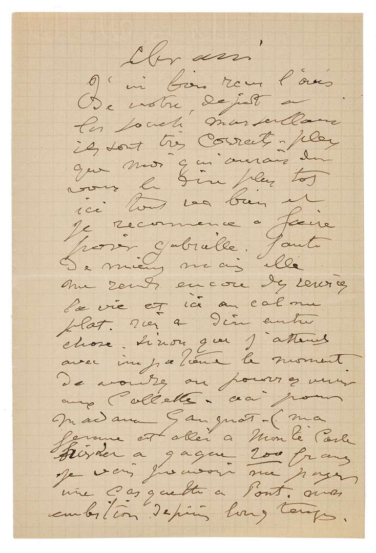 Il a bien reçu l'avis de dépôt à la Société Marseillaise... «Ici tout va bien et je recommence à faire poser Gabrielle faute de mieux mais elle me rend encore des services. La vie est ici au calme plat»... Il attend impatiemment la venue des Gangnat aux Collettes | il raconte : «Ma femme est allée à Monte Carle hier et a gagné 200 francs. Je vais pouvoir me payer une casquette à pont, mon ambition depuis longtemps»... Il recommande à son ami de ne pas se «surchauffer pour garder un peu les globules rouges»...