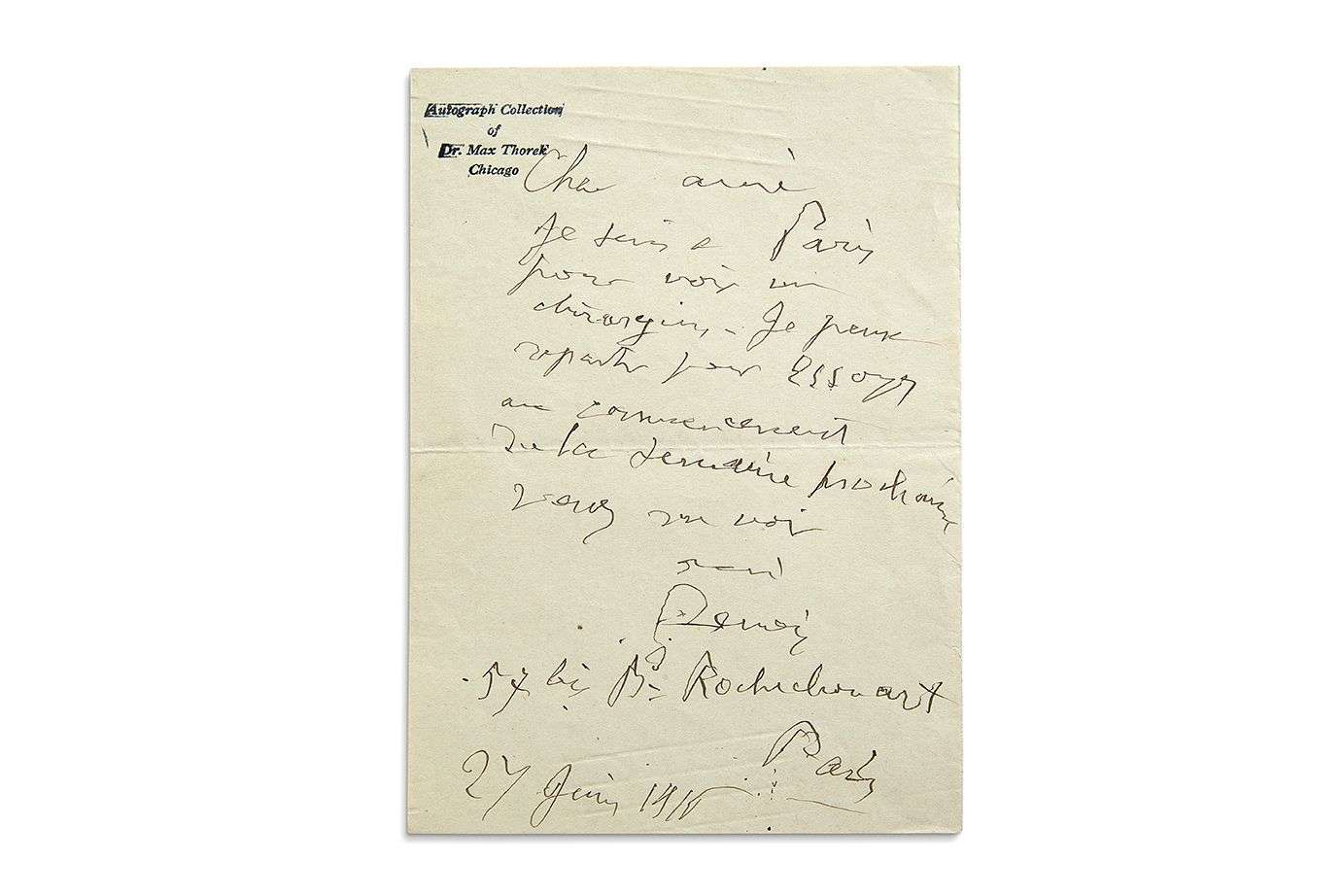 L.A.S. «Renoir», Paris 27 juin 1916, à un ami | 1 page in-8(cachet encre de la collection Max Thorek, Chicago).