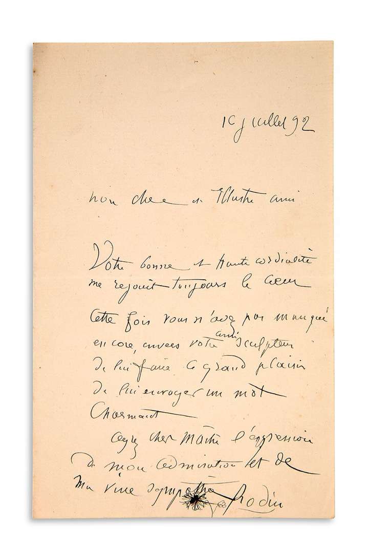 L.A.S. «Rodin» avec dessin d'une fleur, 10 juillet 1892,à un «cher et illustre ami» | 1 page in-8.
