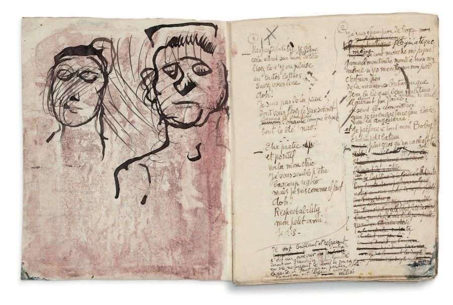 Ce carnet présente d'importantes ratures et corrections, avec de nombreux vers biffés. Il présente au verso du premier feuillet deux dessins à l'encre de Chine : têtes d'homme et de femme, avec lavis violet. Il comprend 25 poèmes, le premier non numéroté, les autres numérotés de 1 à 24.