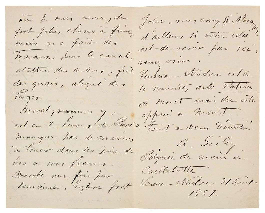 L.A.S. «A. Sisley», Veneux-Nadon 31 août 1881, à Claude MONET| 3 pages in-8.
