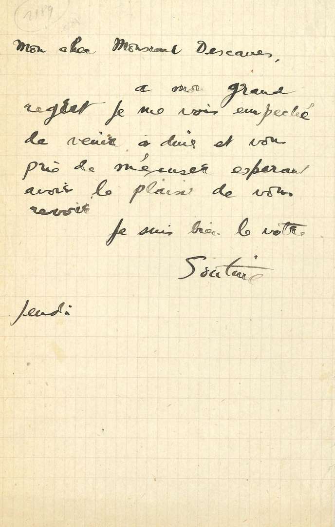 «À mon grand regret je me vois empêché de venir à diner et vous prie de m'excuser espérant avoir le plaisir de vous revoir. Je suis bien le vôtre»... [Figure singulière parmi les collectionneurs, Eugène DESCAVES (1863 - 1934) était le frère de l'écrivain Lucien Descaves. Commissaire de Police à Paris, il collectionnait activement, comme son collègue Léon Zamaron, mais se montrait peu généreux financièrement, monnayant même parfois sa protection aux artistes. Il acheta plusieurs toiles à Soutine quand celui-ci débutait, comme la Nature morte à la lampe (1915 - 1916).]