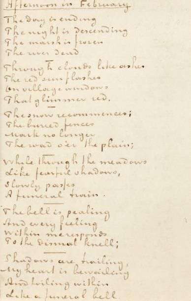 D'un côté du feuillet, Van Gogh a copié les six quatrains du poème funèbre de Henry Wadsworth LONGFELLOW, Afternoon in February : «The day is ending
