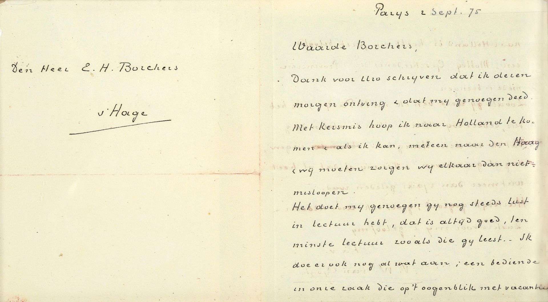 L.A.S. «V. W. van Gogh», Paris 2 septembre 1875, à Egbert BORCHERS à La Haye | 2 pages in-12, adresse, encadrée | en néerlandais.