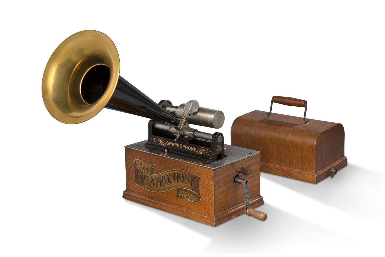 Graphophone a cylindre avec couvercle et pavillon détachable Dimensions sans pavillon : H. 28 x L. 36 x P. 18 cm