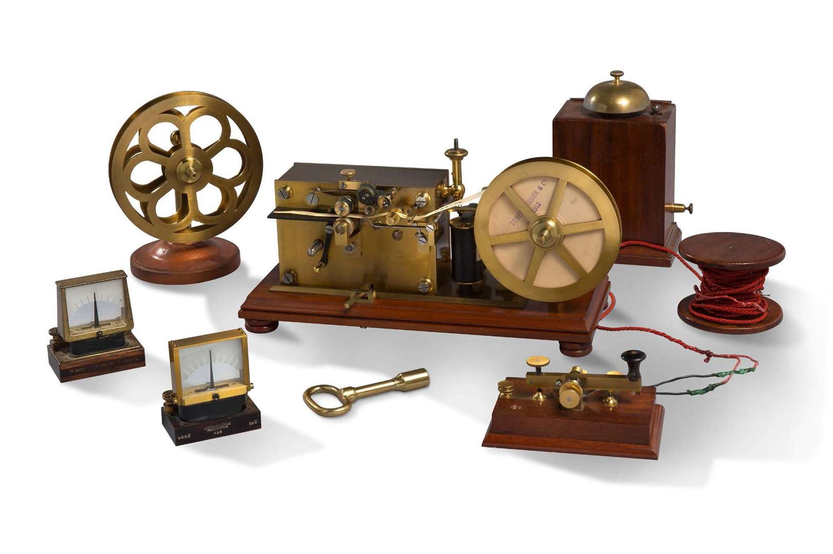 Télégraphe inscripteur en laiton sur support en bois, avec sa clef de remontage, son manipulateur et une bobine réceptrice