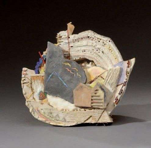 Vaisseau Assemblage bois, carton, pierre Signé, titré et daté 1981 21 x 22 cm