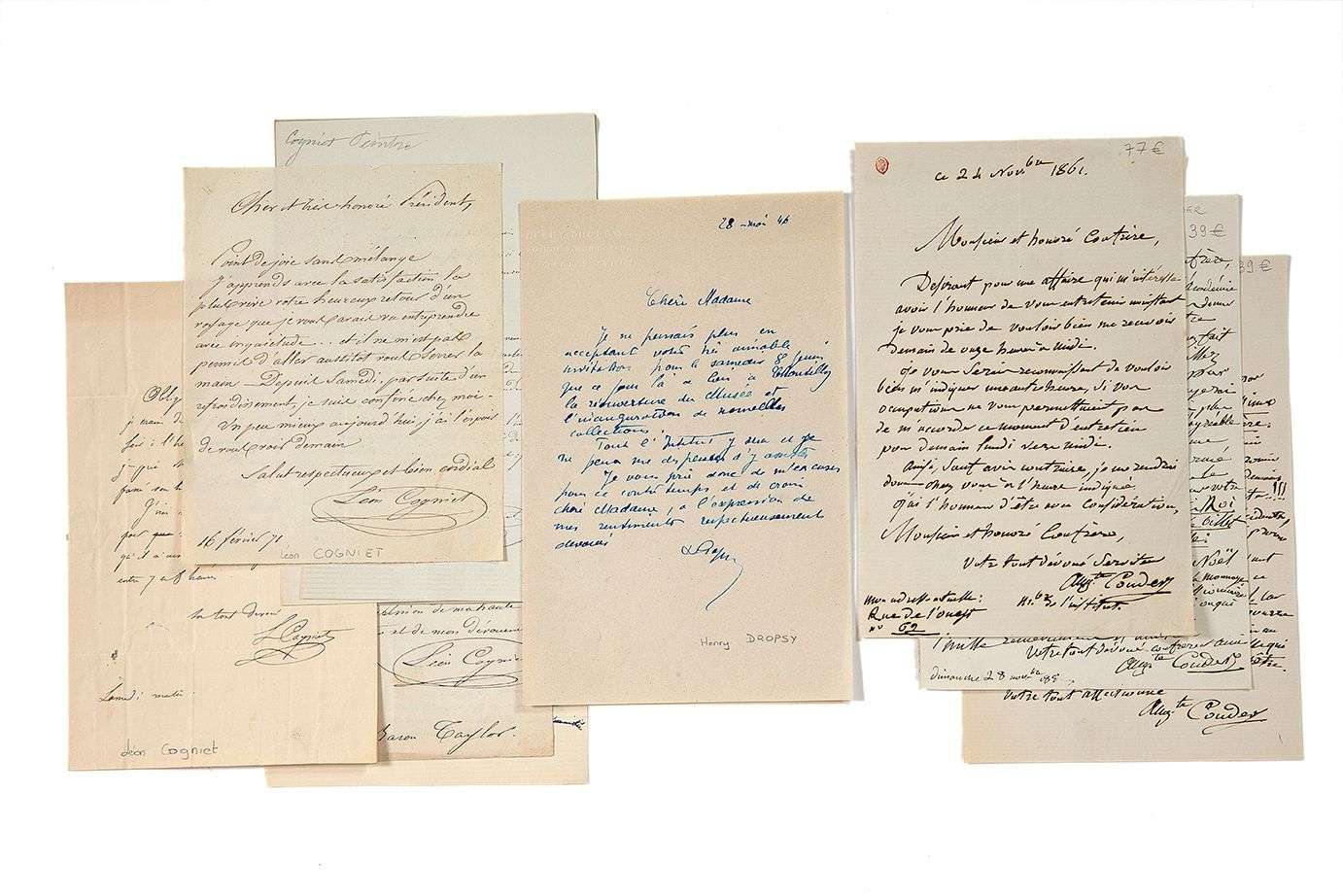 7 L.A.S. "Léon Cogniet" ou "LCogniet", s.l.n.d.. Divers formats (pliures, manques dûs aux cachets de cire). 1 brouillon de lettre in-8 (ratures, ajouts, bord effrangé).
