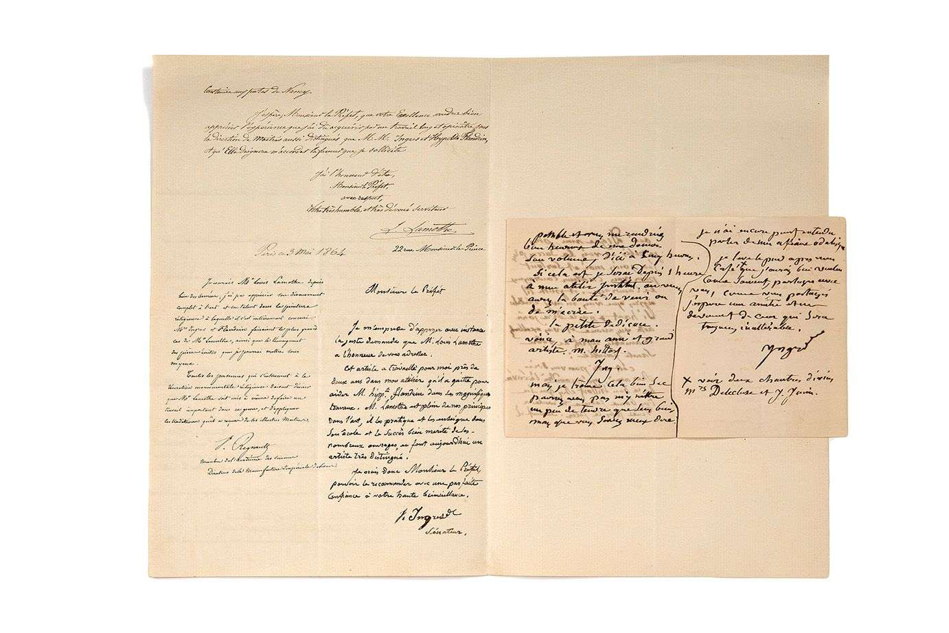 Apostille autographe signée "J. Ingres sénateur", Paris, 3 mai 1864, sur une L.A.S. de Louis LAMOTHE (1822-1869) au baron HAUSSMANN, sénateur et préfet du département de la Seine.