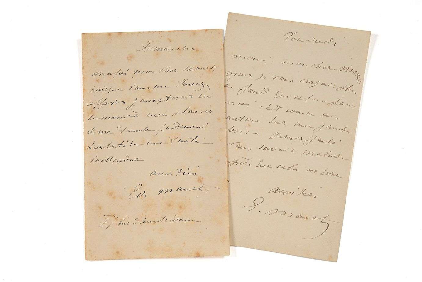 2 L.A.S. "E. Manet", s.l.n.d., adressées à "Mon cher Monet". 2 pages in-12 (taches brunes).