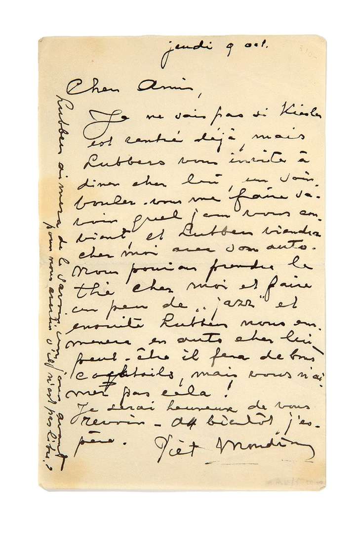 « Cher ami, je ne sais pas si Kiesler [l'architecte Frederick (1890-1965)] est rentré déjà, mais Lubbers [le peintre néerlandais Adriaan Lubbers (1892-1954)] vous invite à diner chez lui, un soir. Voulez-vous me faire savoir quel jour vous conviendrait et Lubbers viendra chez moi avec son auto. Nous pourrions prendre le thé chez moi et faire un peu de « jazz » et ensuite Lubbers nous emmènera en auto chez lui, peut-être il fera de bons cocktails, mais vous n'aimez pas cela ! [...] ».