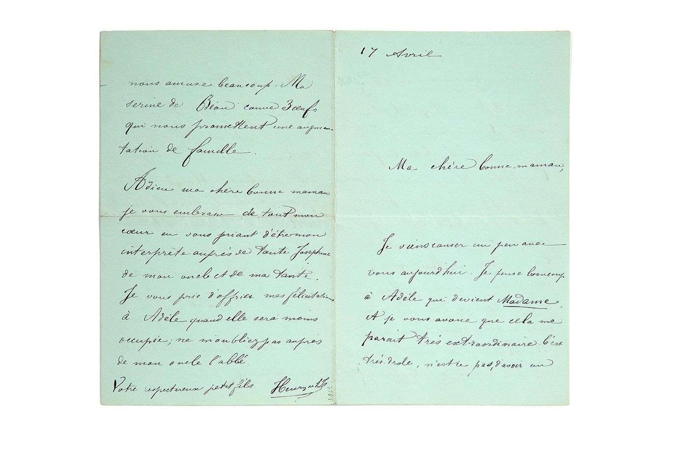 L.A.S. de jeunesse, adressée à sa grand-mère. S.l.n.d. « 17 avril ». 4 pp. in-8. Papier bleu.