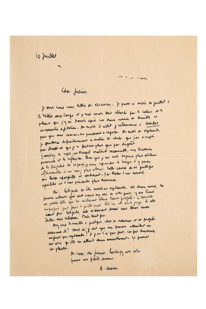 L.A.S. "A Camus", s.l., 10 juillet [1945], adressée à Raymond GUERIN, écrivain français. 1 page in-4.