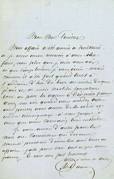 Son affaire « a été remise à huitaine. [...] il a été fait grand bruit à l'audience d'hier du luxe au milieu duquel je vis et de mon mobilier somptueux dont on porte la valeur à dix mille francs ». Il prie Feuillet de venir s'assurer de la vérité et d'en informer les juges de sa connaissance.