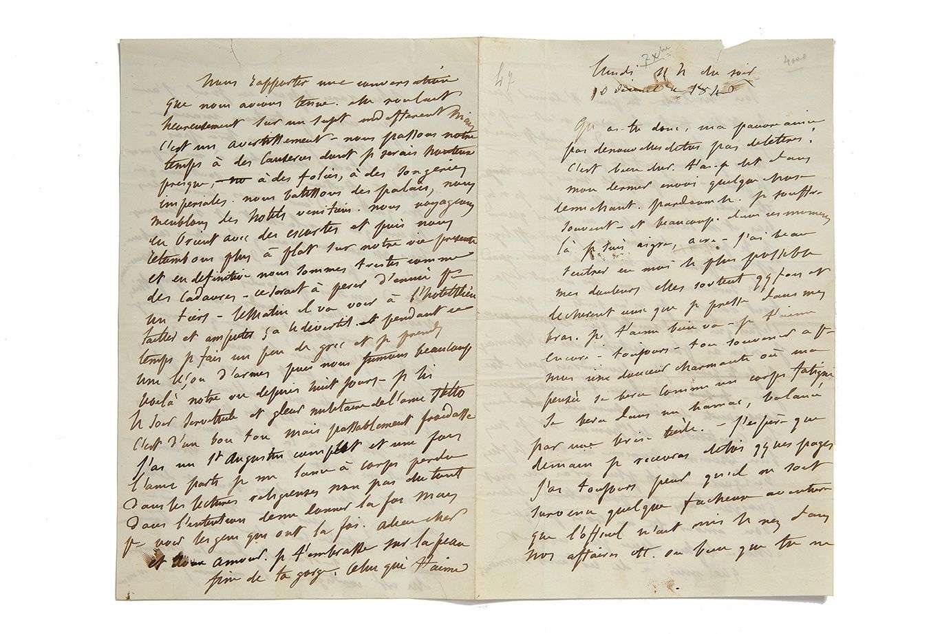 L.A.S. « celui qui t'aime », adressée à Louise Colet. S.l., [7 décembre] 10 décembre 1846 « Lundi 11h du soir ». 4 pp. in-8. Minime déchirure en tête, sans atteinte au texte ni manque.