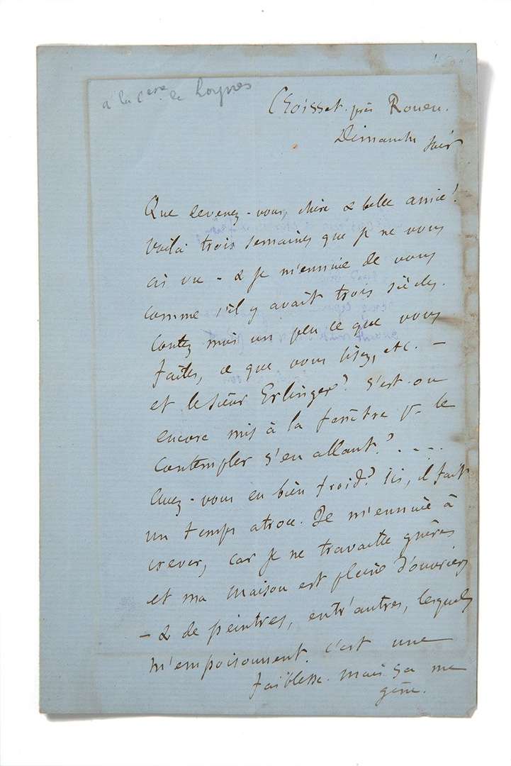 L.A.S., Croisset près Rouen, [21 mai 1865], adressée à [Jeanne de TOURBEY]. 2 pages in-8 (mouillures).