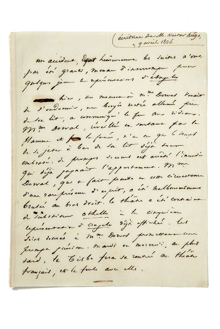 Communiqué de presse autographe, s.l., [9 avril 1836], relatif à la reprise d'Angelo à la Comédie Française, en mars et avril 1836. 1 page in-4 (rature, pliures, petit manque marginal).