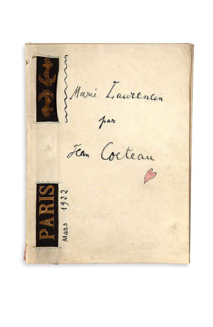 Ce manuscrit, probablement inédit, se présente comme une brochure spécialement conçue par les deux artistes pour Marie Laurencin, avec des pages manuscrites de Cocteau et un autoportrait de Marie Laurencin. Il est recouvert d'une belle couverture illustrée sur laquelle Cocteau a calligraphié : " Marie Laurencin par Jean Cocteau" accompagné d'un coeur rouge. A l'extrème gauche, un ruban noir glissé dans la couverture à impression dorée portant "Paris" et deux ancres marines. Le long du ruban figure la date de Mars 1922 de la main de Cocteau. contenu : un feuillet blanc - un feuillet sur lequel a été contrecollée la reproduction du portrait de Cocteau par Marie Laurencin daté 1921 - l'autoportrait de Marie Laurencin à l'écharpe rose, daté 1923, crayon sur papier signé et daté en bas à droite. (285 x 215 mm) et 6 ff. 1/2 in-4 (282 x 212 mm) titré "Marie Laurencin".