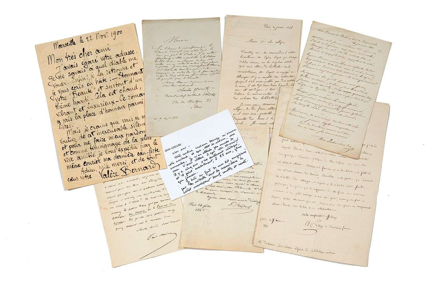 Ensemble d'environ 100 L.A., tapuscrits ou billets, d'époques diverses, tels que COCTEAU, PEYRE, DUHAMEL, ROUGEMONT, SALMON, FARRERE, AVELINE, DALLOZ, MAUROIS, CLAIR, Madame de STAEL, GUT, etc.