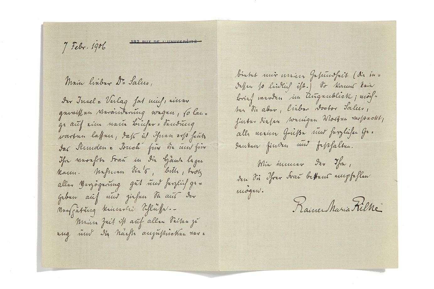 L.A.S., Paris, 7 février 1906, 2 pages sur feuilles doubles. In-8. Adressée à l’écrivain et médecin Hugo Salus (1866-1929), en allemand. Sur papier à lettres, avec l'adresse de Rilke : 182 rue de l'Université ».