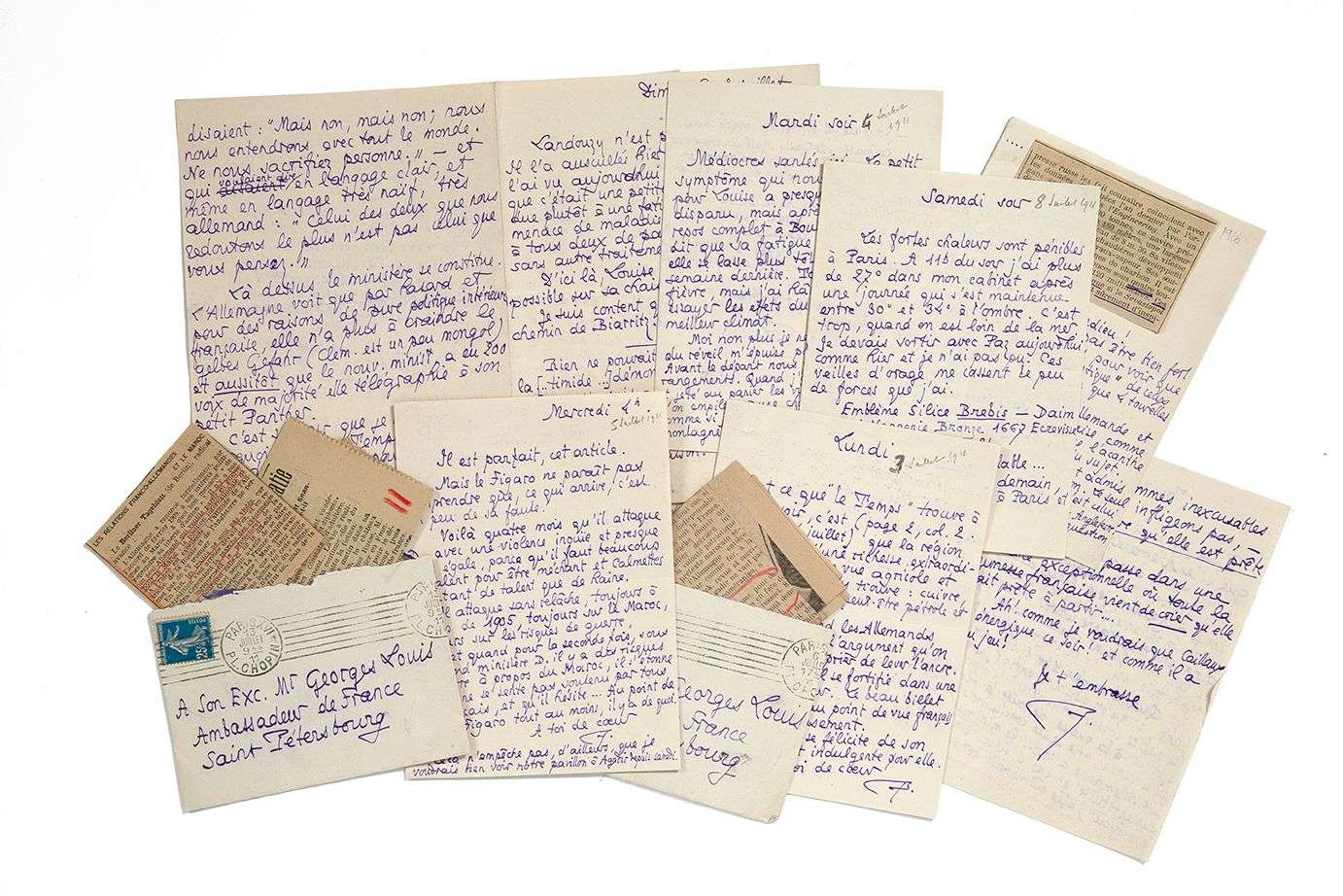 Coupures de presse jointes dont 2 collées | 2 enveloppes à l’adresse de Georges Louis comme ambassadeur de France à Saint-Pétersbourg (timbres, marques postales dont deux de la poste russe).