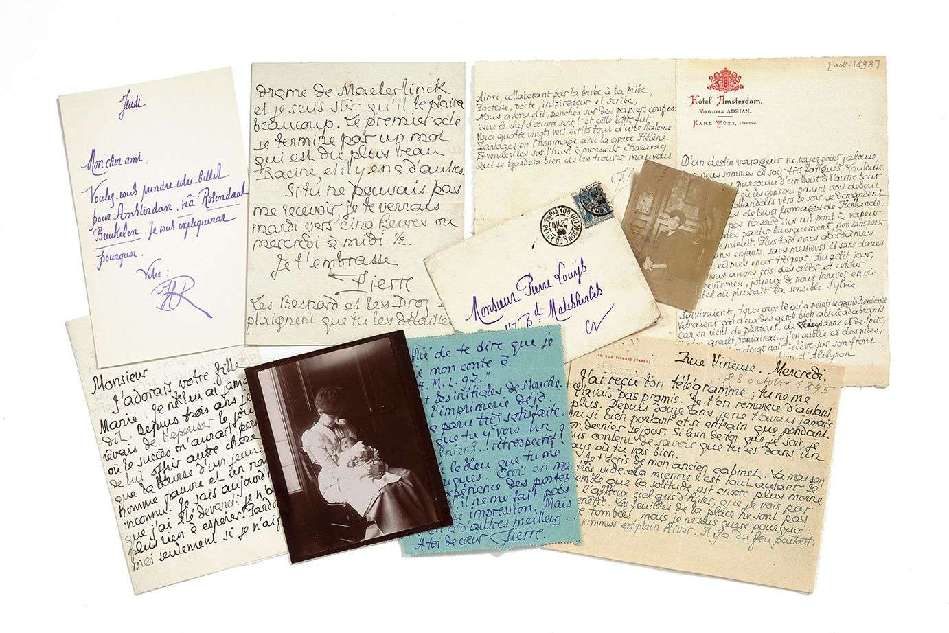 1 lettre adressée à José-Maria de HEREDIA, 2 lettres et 1 pneumatique à son frère Georges LOUIS, et 1 lettre en vers adressée à Louise de HEREDIA, accompagnées d’1 lettre d’Henri de Régnier. Enveloppe à Pierre Louÿs et 2 photographies de Marie de Régnier prises par Pierre Louÿs.