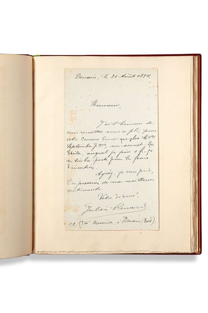 Reliure plein maroquin rouge janséniste, dos à nerfs avec mention « Jules Renard - Des vers MS », six filets dorés en encadrement intérieur, tête dorée (Canape R D, 1924).