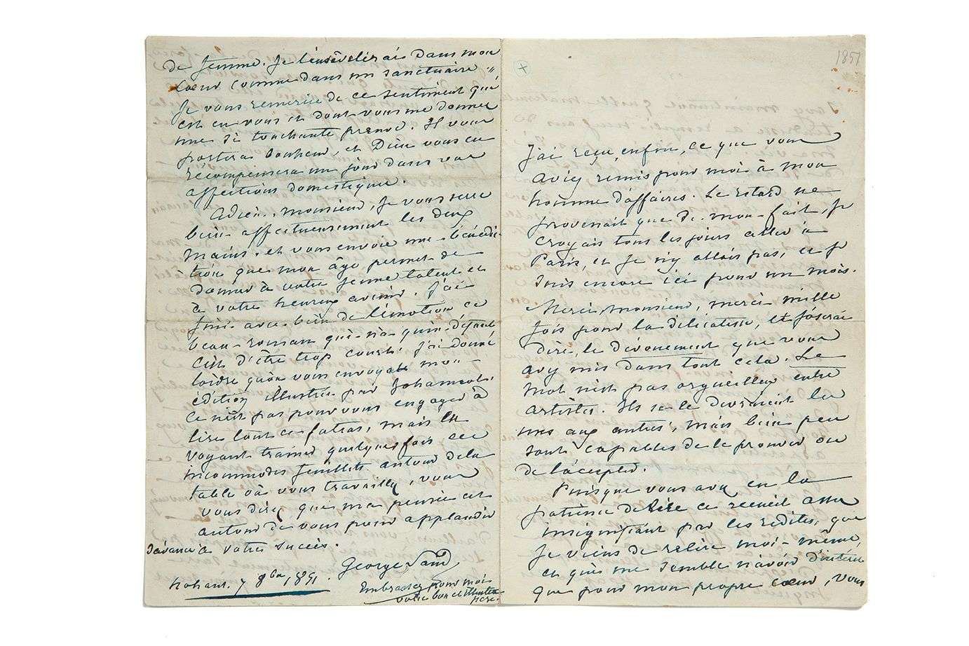 Longue et belle lettre : « J'ai reçu, enfin, ce que vous aviez remis pour moi à mon homme d'affaires [Gabriel Falampin]. Le retard ne provenait que de mon fait, je croyais tous les jours aller à Paris, et je n'y allais pas et je suis encore ici pour un mois. Merci, Monsieur, merci mille fois pour la délicatesse, et j'oserai dire, le dévouement que vous avez mis dans tout cela. Le mot n'est pas orgueilleux entre artistes. Ils se le devraient les uns aux autres | mais bien peu sont capables de le prouver ou de l'accepter. Puisque vous avez eu la patience de lire ce recueil assez insignifiant par les redites, que je viens de relire moi-même, et qui me semble n'avoir d'intérêt que pour mon propre coeur, vous savez maintenant quelle maternelle tendresse a rempli neuf ans de ma vie. Certes, il n'y a pas là de secret, et j'aurais plutôt à me glorifier qu'à rougir d'avoir soigné et consolé, comme mon enfant, ce noble et inguérissable coeur. Mais le côté secret de cette correspondance, vous le savez maintenant. Illl nn'est pas bien grave mais il m'eût été douloureux de le voir commenter et exagérer. On dit tout à ses enfants, quand ils ont âge d'homme. Je disais donc alors à mon pauvre ami ce que je dis maintenant à mon fils. Quand ma fille me faisait souffrir par les hauteurs et les aspérités de son caractère d'enfant gâté, je m'en plaignais à celui qui était mon autre moi-même. Ce caractère, qui m'a bien souvent navrée et effrayée, s'est modifié grâce à Dieu et à un peu d'expérience. D'ailleurs l'esprit inquiet d'une mère s'exagère ces premières manifestations de la force, ces défauts qui sont souvent son propre ouvrage, quand elle a trop aimé ou trop gâté. De tout cela au bout de quelques années, il n'est plus sérieusement question. Mais ces révélations familières peuvent prendre de l'importance à de certains yeux malveillants | et j'aurais bien souffert d'ouvrir à tout le monde ce livre mystérieux de ma vie intime, à la page où est écrit tant de fois, avec des sourires mêlés de larmes, le nom de ma fille. Pour rien au monde cependant, je ne vous aurais demandé de me renvoyer la copie que vous aviez commencé à faire. Je savais que vous me la renverriez ou que vous la brûleriez aussitôt que vous auriez compris le motif de mes inquiétudes [...] ». Elle ajoute « J'ai fini avec bien de l'émotion ce beau roman qui n'a qu'un défaut, c'est d'être trop court ! J'ai donné l'ordre qu'on vous envoyât mon édition illustrée par Johannot. Ce n'est pas pour vous engager à lire tout ce fatras, mais en voyant traîner quelquefois ces incommodes feuillets autour de la table où vous travaillez, vous vous direz que ma pensée est autour de vous pour applaudir d'avance à votre succès ». Sand ajoute : « Embrassez pour moi votre bon et illustre père ».