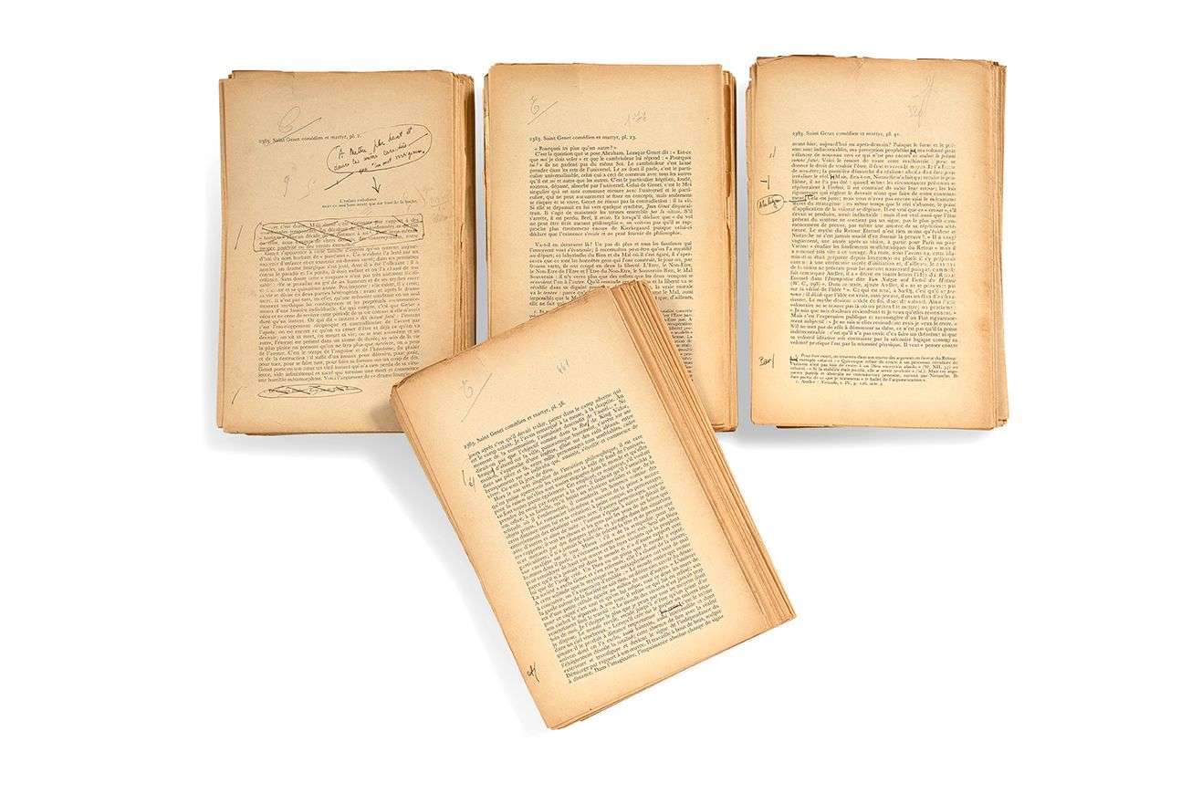 "Saint Genet comédien et martyr". Paris : Gallimard, 1932. 71 placards, comportant chacun 8 pages in-8 (252 x 167 mm). Quelques salissure et petites taches, quelques déchirures dans les marges et aux pliures.