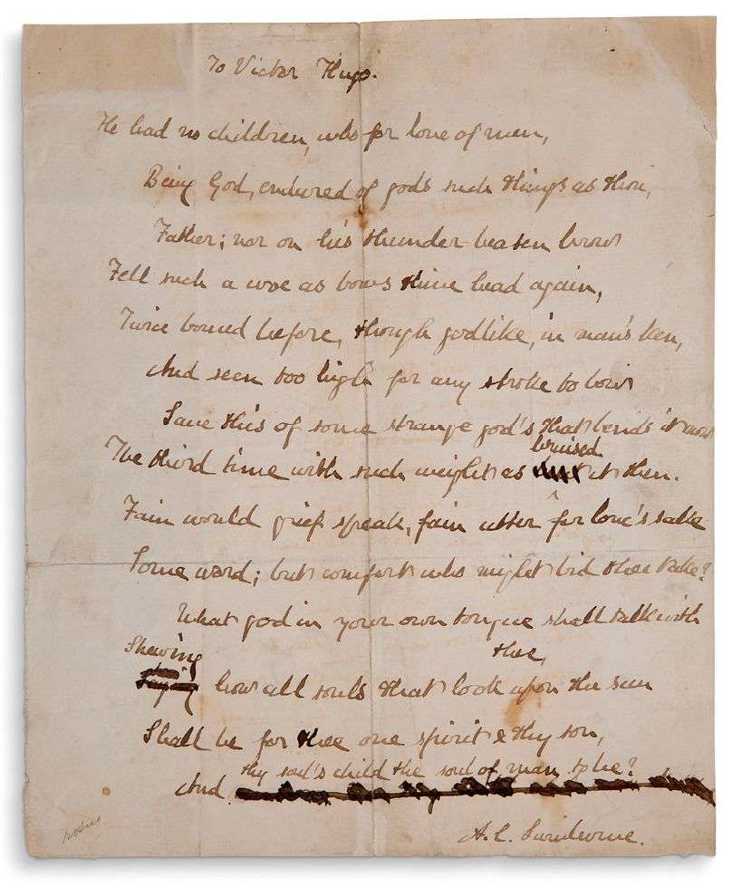 To Victor Hugo, poème autographe signé en anglais, [1876] | 14 vers sur une page in-4, ratures et corrections