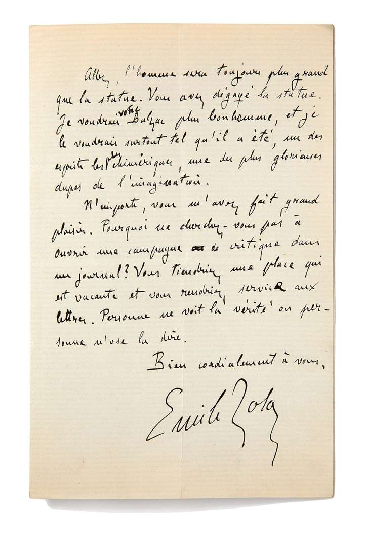 Lettre dans laquelle Zola complimente son ami, Paul Bourget, pour son article sur Balzac. C’est alors l’occasion pour Zola de donner sa vision du grand écrivain réaliste.