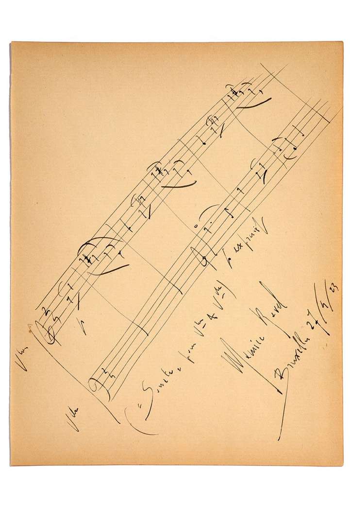 Beau manuscrit musical figurant une portée de notes extraites de "Sonate pour Violon et Violoncelle" de Ravel, titré, daté et signé, avec annotation "expressif", de la main du maître.