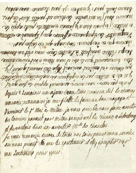 Elle lui adresse des lettres à envoyer à diverses personnes, et le remercie d'avoir cherché les livres qu'elle lui demandait | elle espère qu'ils ne sont pas perdus, et qu'ils lui parviendront bientôt. Il y a eu un incendie à Mittau « par la négligence ou malveillance de soldats nos voisins. [...] Heureusement que le Roi et mon mari n'ont courus aucun danger [...] mais c'est un nouveau charme que ce dangereux voisinage qui ne laisse pas d'augmenter la répugnance affreuse que j'éprouve à retourner à Mitau, j'esperois bien n'y jamais remettre les pieds après la manière dont j'en suis sortie » | elle doit y arriver le 5 mai...