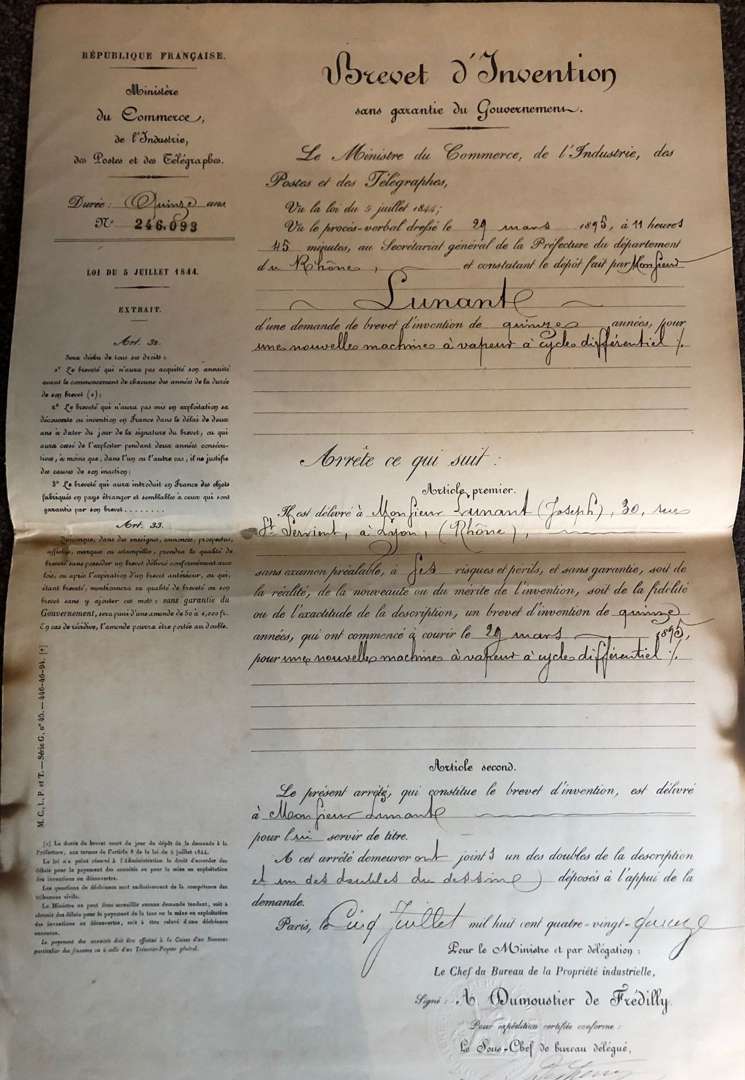 Brevet d'invention pour « un moteur à air dilaté par la combustion du pétrole », avce plan (1881) | plus Patent-Urkunde pour l'Allemagne (1882). Brevet d'invention pour « un nouveau moteur à gaz à condensation » (1886). Lettres patentes au nom de la Reine Victoria au nom de Benjamin Joseph Barnard Mills (1881) pour exploiter l'invention de Lunant sur le pouvoir moteur. Brevet d'invention pour « une nouvelle machine à vapeur à cycle différentiel », avec 3 plans (1895). Brevet d'invention pour « un nouveau protecteur de bandage pneumatique dit “jante mixte” », avec plan (1900). Brevet d'invention pour « un réducteur automatique de vitesses », avec plan (1906). Brevet d'invention pour un « système d'enclanchement de changement de vitesses » (1907).