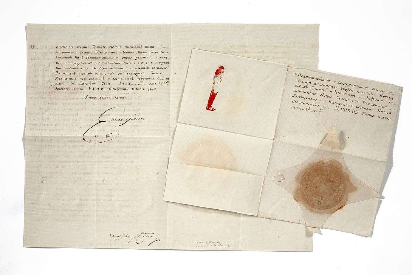 L.S., contresignée par Ivan Ostermann, ministre des Affaires étrangères, en russe, adressée à FERDINAND IER, Tsarskoe Tselo [Saint-Pétersbourg], 5 juillet 1792, roi des Deux-Siciles.
