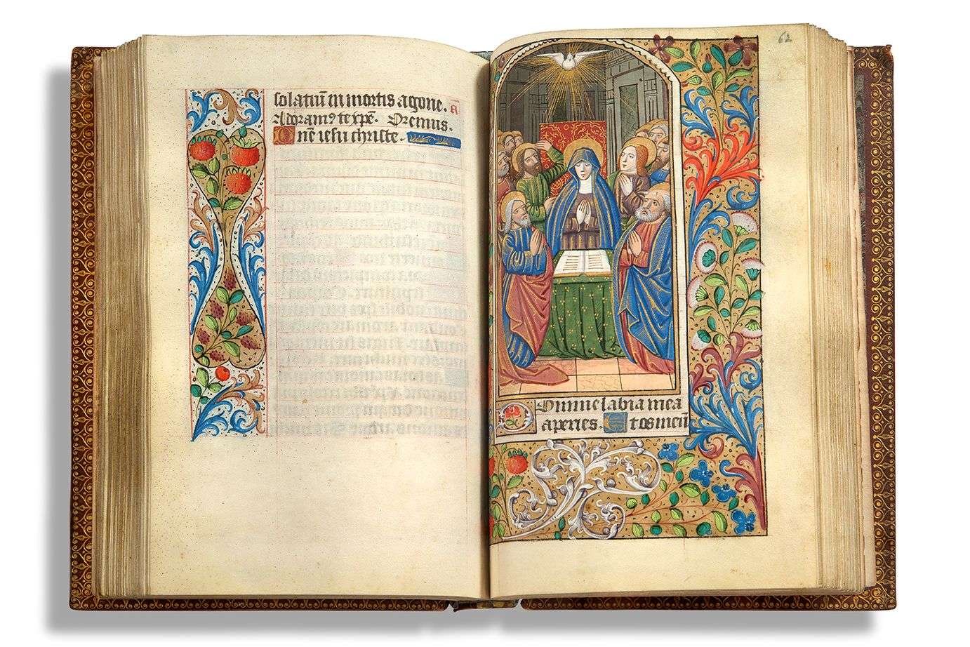 In-12, 106 ff. de parchemin à 20 longues lignes (121x182mm) | à l'encre noire, bleue (calendrier), rouge ou dorée, réglures à l'encre rouge, foliotation moderne au coin supérieur au crayon, écriture textualis libraria, 12 grandes miniatures de l'atelier de l'artiste rouennais Robert Boyvin avec des encadrements de Jean Serpin ornés de de fleurs, fruits, animaux et rinceaux, bandeaux peints et dorés composés de fleurs, fruits et rinceaux à compartiments alternés de formes géométriques (damier, losanges, cœurs, cercles, ruban, etc.), lettrines peintes et dorées.