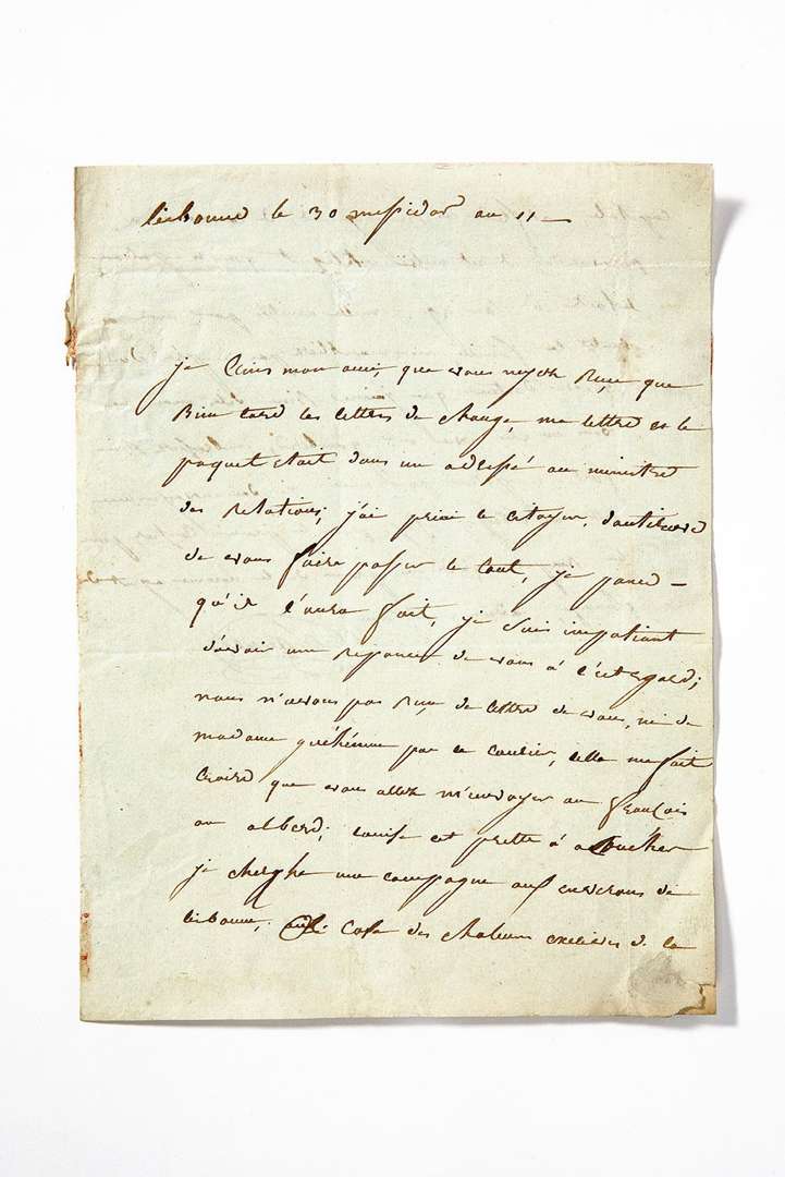 L.A.S "Lannes", Lisbonne, [30 messidor an 11 ou 19 juillet 1803], adressée à un ami.1 page et demie in-4 (pliures, manques dûs aux cachets sans atteinte au texte).
