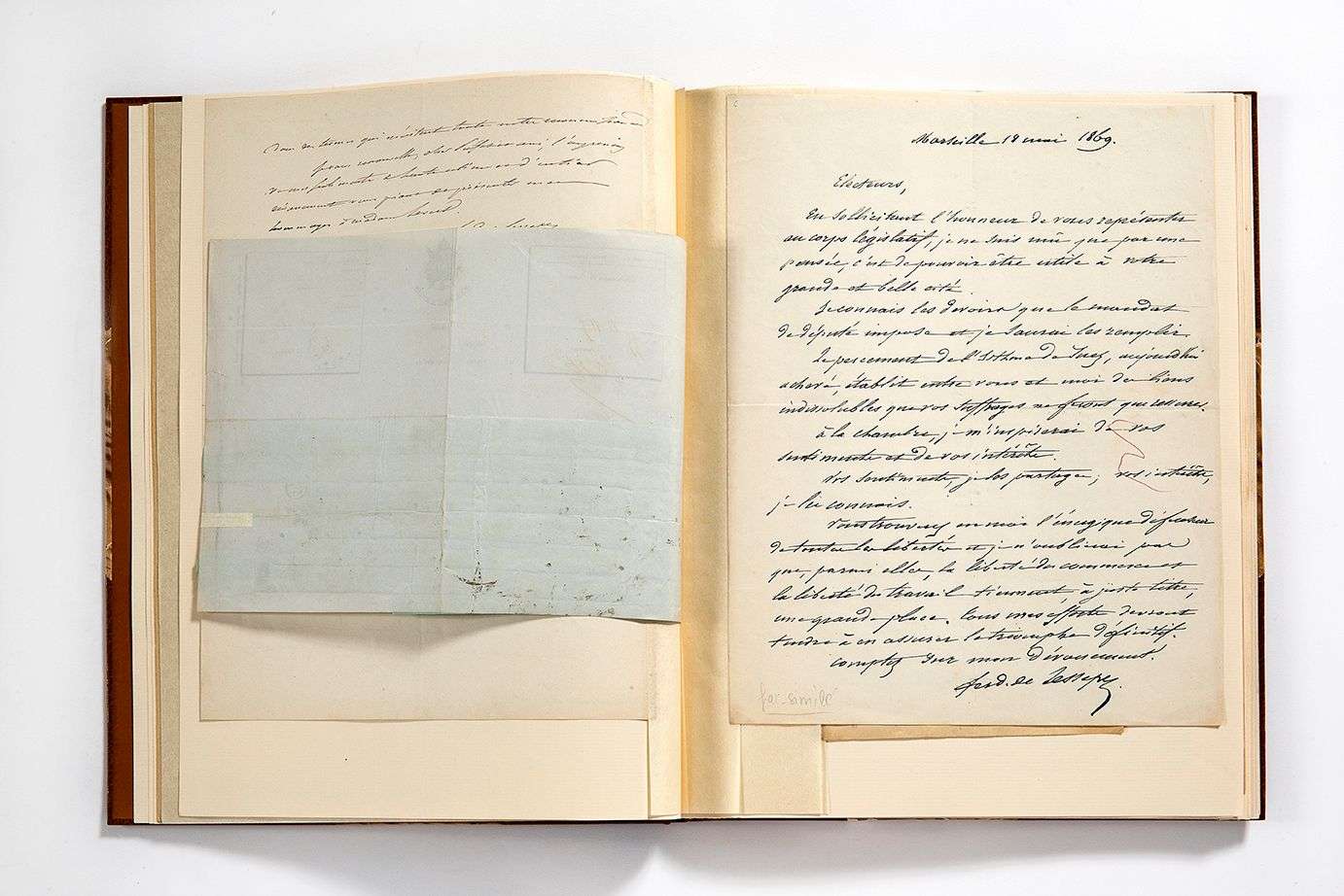 Environ 35 L.S. ou pièces signées, 2 L.A.S. Photo dédicacée + un portrait litho, télégrammes + 3 imprimés sur le canal de Suez.