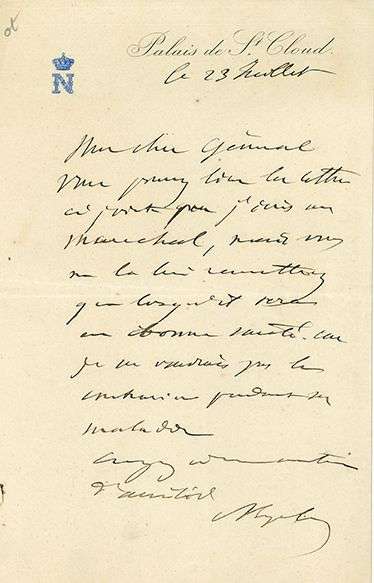 L.A.S., Palais de St Cloud 23 juillet, à un général | 1 page in-8 à son chiffre couronné.