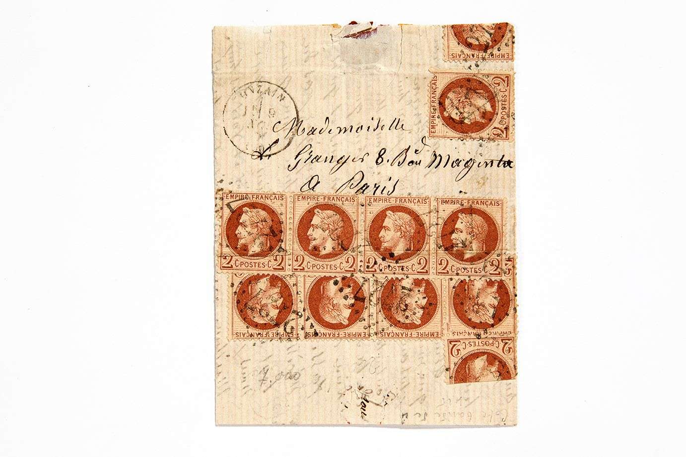 2c lauré 2 bandes de quatre et 2 exemplaires (un coupé à l'ouverture, l'autre petit déf.) et 5 autres à cheval sur le recto et le verso, oblitérés GC 2727 càd ONZAIN (40) 9 NOV.70 sur Lm datée Onzain 8 novembre 1870 pour Paris. Affranchissement exceptionnel pour une tentative d'entrée. Rare et TB.