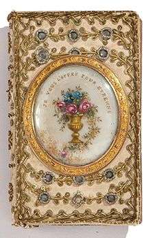 Rare almanach dans une ravissante et peu commune reliure de l'époque, ornée de pièces métalliques rebrodées de fils d'or et d'argent, et de deux médaillons sous verre.