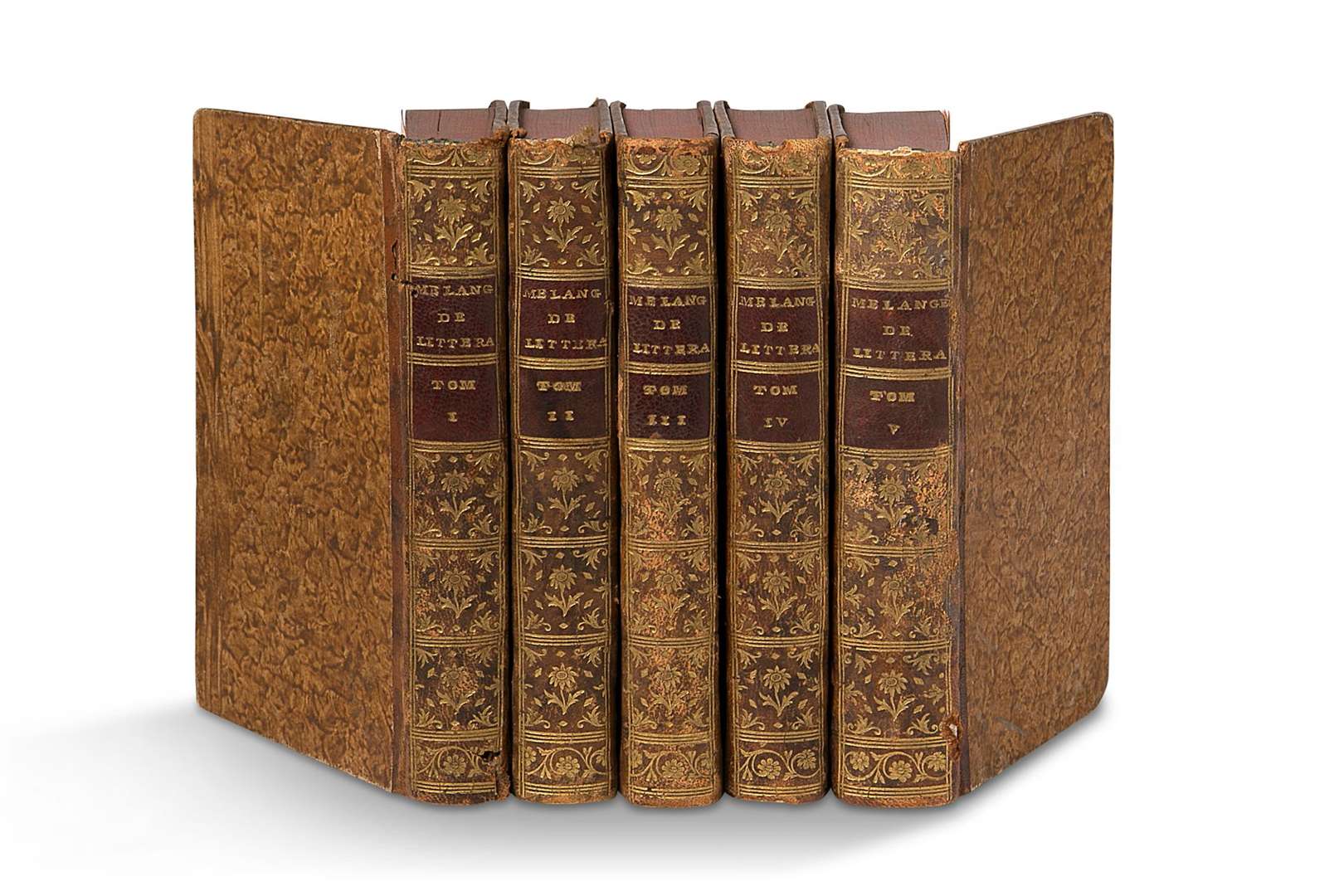 5 volumes in-8 (170 x 103 mm), 412 -456-435-464-610 pp. Demi-veau blond moucheté, dos lisse ornés, pièces de titre et de tomaison de maroquin rouge, tranches rouges (reliures postérieures).